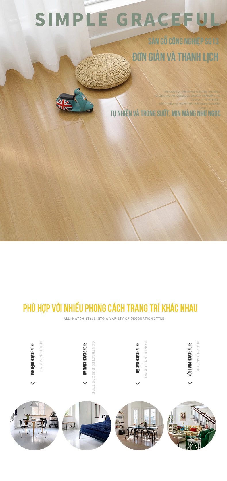 Sàn gỗ SG13 có nhiều màu sắc khác nhau, giúp bạn dễ dàng lựa chọn sử dụng trong nhiều không gian mang các phong cách khác nhau từ phong cách hiện đại cho tới phong cách pha trộn. SG13 được thiết kế mang vẻ đẹp của vân gỗ tự nhiên nên mặc dù được làm từ gỗ công nghiệp nhưng bạn vẫn rất khó để cảm nhận được sự khác biệt với các sản phẩm sàn gỗ tự nhiên khác.