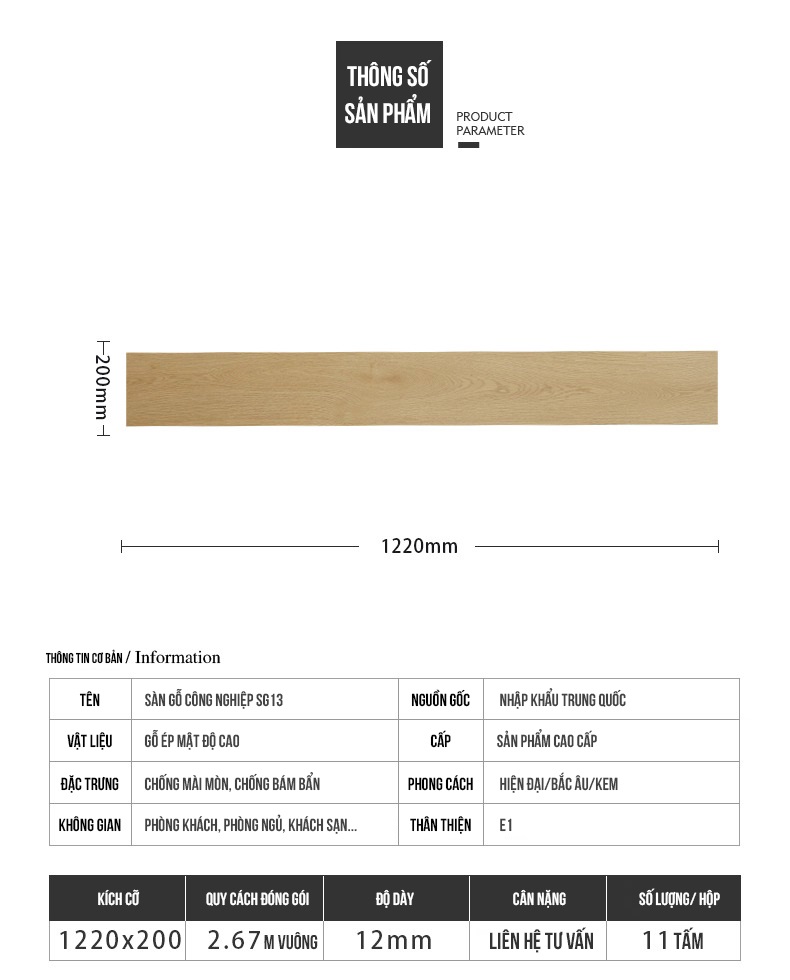 Sàn gỗ SG13 được thiết kế dạng tấm với chiều dài 1220mm và chiều rộng 200mm, phong cách thiết kế truyền thống giúp sản phẩm có vẻ đẹp tự nhiên và vô cùng sang trọng.